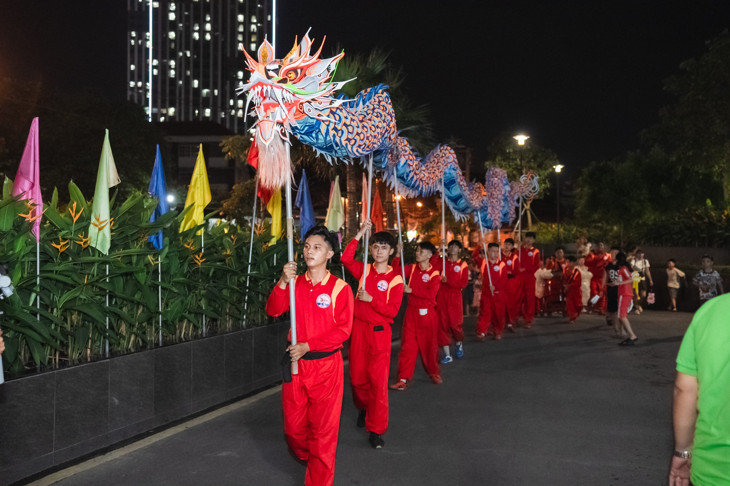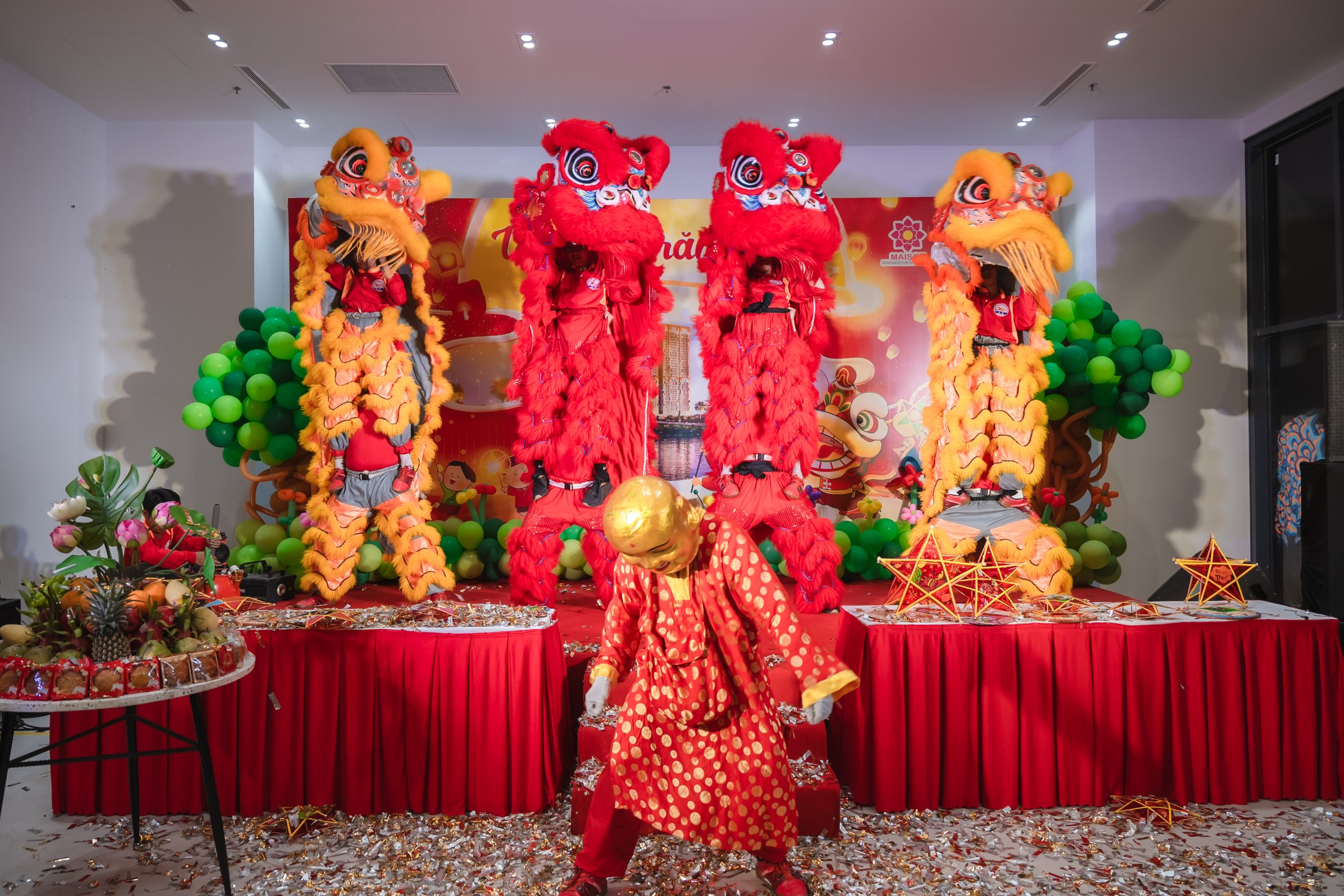 Khi đêm buông xuống, đoàn lân – sư – rồng tiến vào sân trong tiếng trống rộn ràng, mở đầu cho chương trình “Trung Thu Sum Vầy – Đêm Hội Ánh Trăng 2025”. Màn biểu diễn công phu, đầy năng lượng không chỉ làm trẻ nhỏ thích thú mà còn mang đến thông điệp cầu chúc bình an – tài lộc – hạnh phúc cho toàn thể cư dân HT-Pearl.